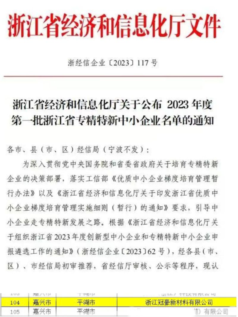 近日,浙江省經信廳公布了《關于2023年度第一批浙江省專精特新中小企業》名單,浙江冠豪順利通過省級“專精特新”企業認定工作,并取得了證書。